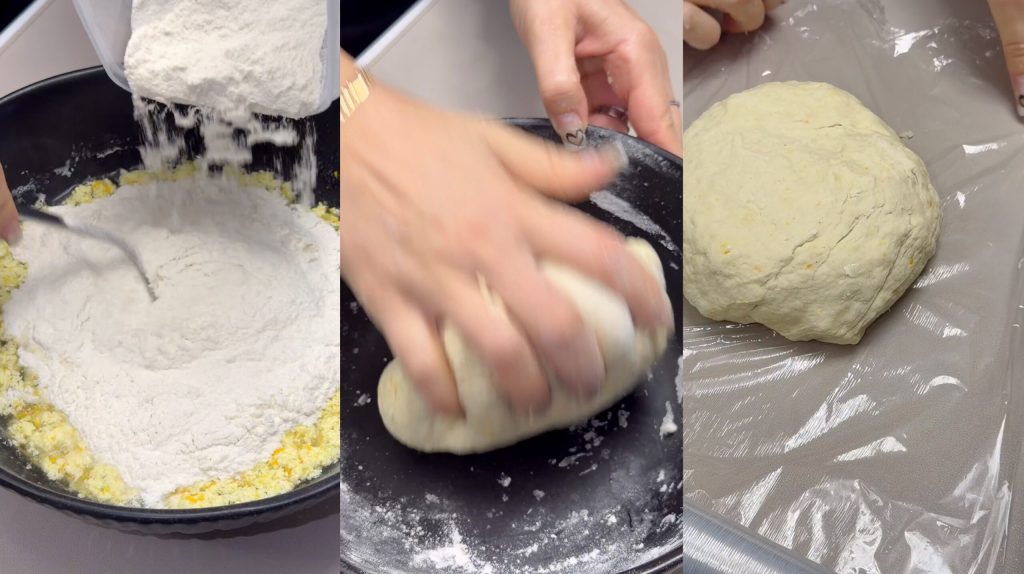 • Voeg het meel toe, meng en kneed snel tot je een glad deeg hebt. Vorm een bal, wikkel het in voedselfolie en leg het ongeveer 30 minuten in de koelkast.
