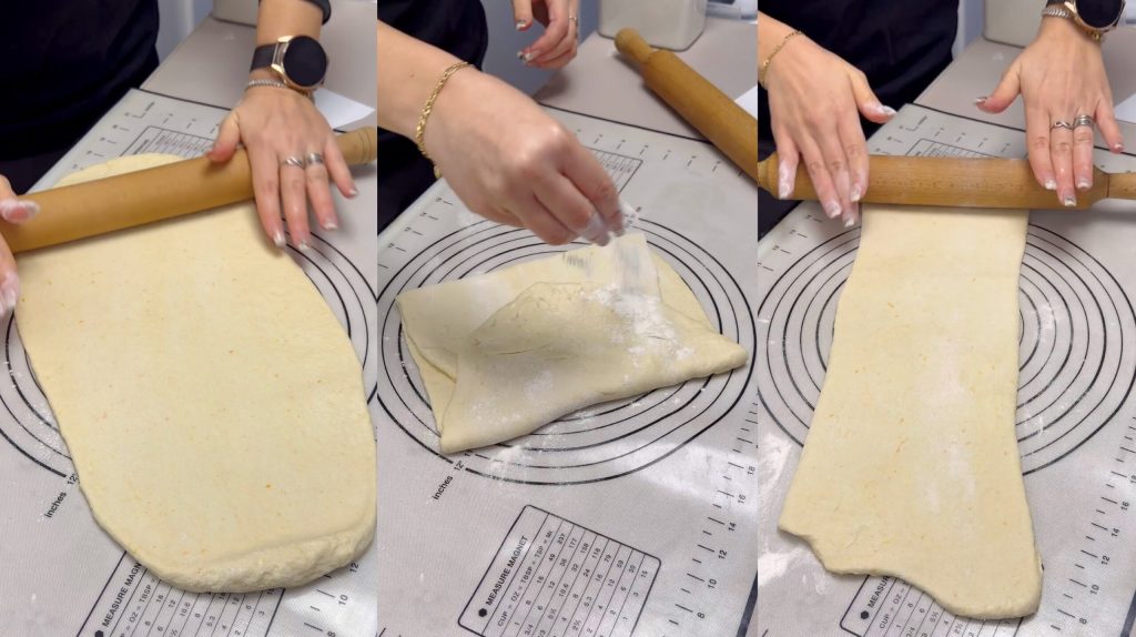 • Na het rusten, rol het deeg uit en maak vouwen. Herhaal deze stap meerdere keren: dit is het echte geheim voor het verkrijgen van lichte, krokante chiacchiere vol bubbels.