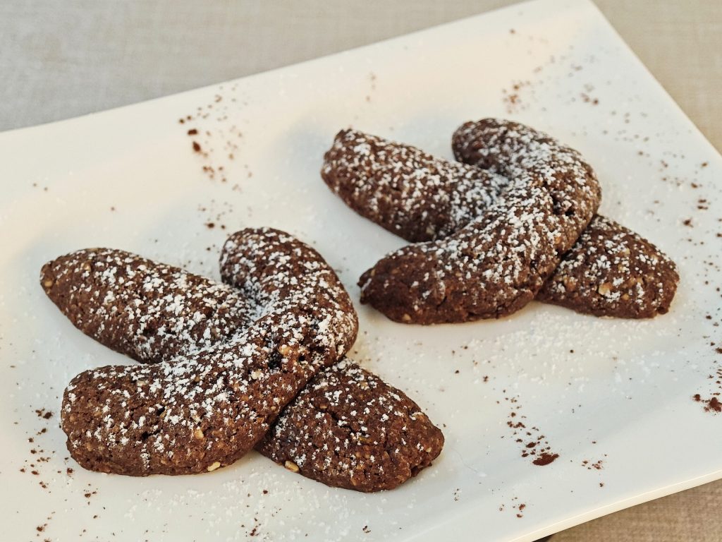 Doe de bloem, suiker, amandelmeel, bakpoeder, vanille, citroenschil, sinaasappelschil, cacao in een kom en meng.