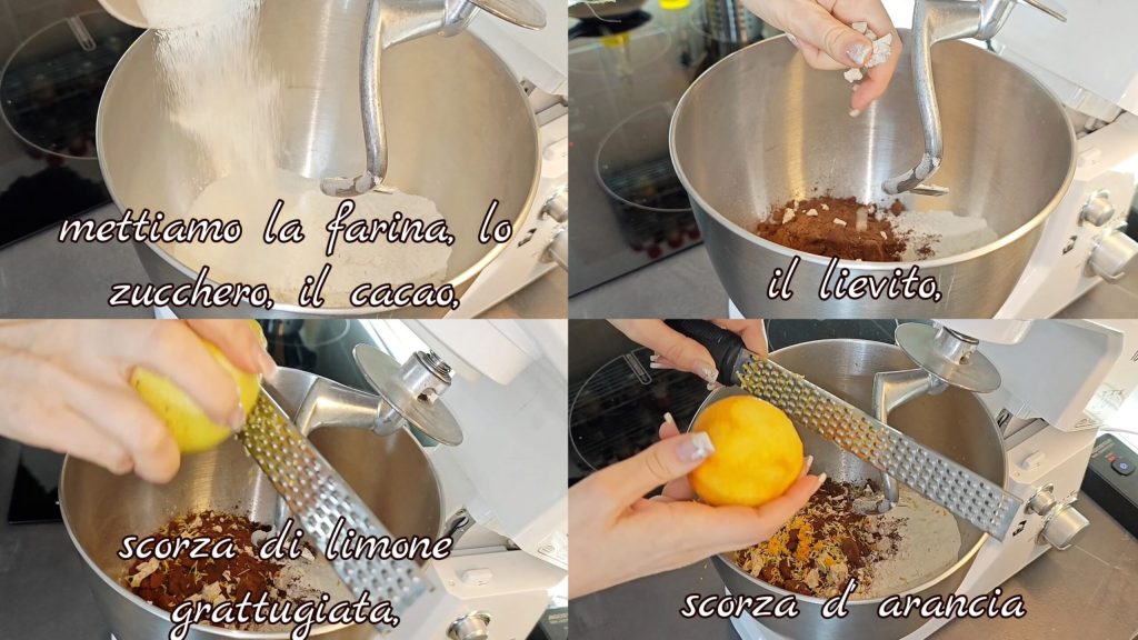 We doen de meel, suiker, cacao, gist, geraspte citroenschil, sinaasappelschil,