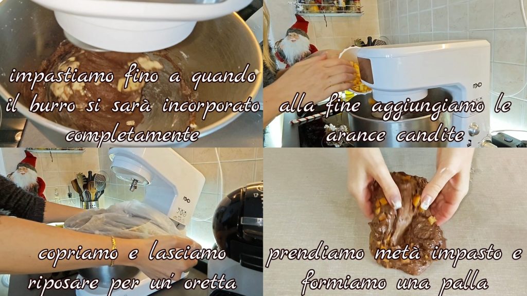 • kneed totdat het volledig is opgenomen. Voeg dan de gekonfijte sinaasappels toe. Dek het deeg af en laat het ongeveer een uur rusten. Na ongeveer een uur nemen we de helft van het deeg en vormen een bal,