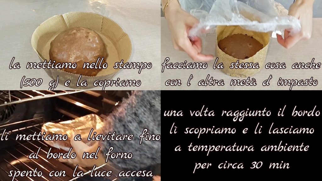 • we plaatsen het in een panettone vorm van 500 g en dekken het af. Doe hetzelfde met de resterende helft van het deeg, plaats ze vervolgens in de uitgeschakelde oven met het licht aan en laat ze rijzen tot de rand. Eenmaal aan de rand, haal ze eruit en laat ze ongeveer 30 minuten op kamertemperatuur staan.