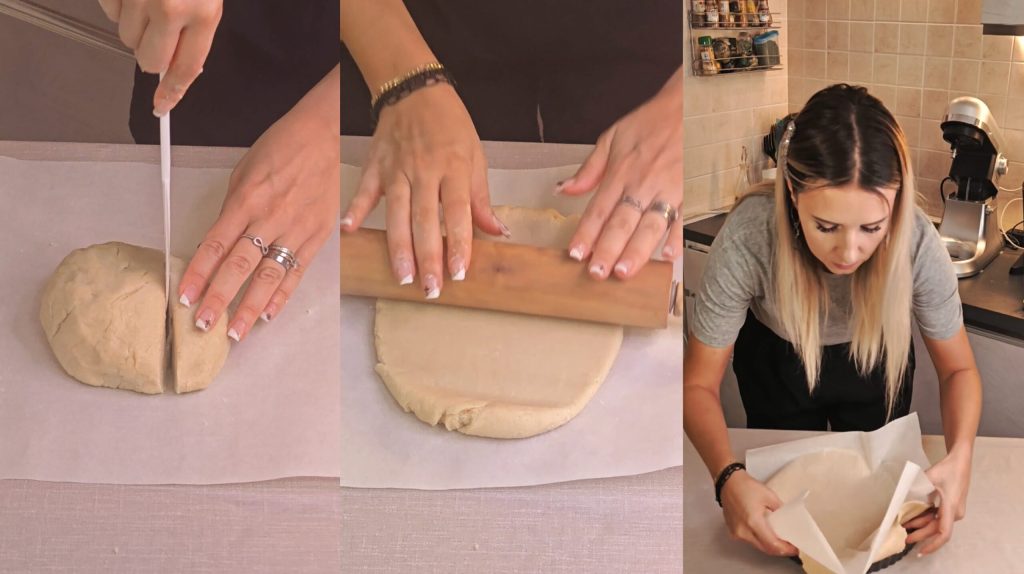 Haal het deeg uit de koelkast en verdeel het in twee delen: gebruik ongeveer ¾ van het deeg voor de basis. Rol het uit op een vel bakpapier en plaats het in de vorm,