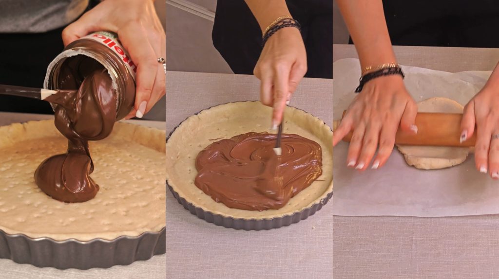 Giet de vegan Nutella erin en smeer gelijkmatig over de hele oppervlakte. Rol het resterende deeg uit