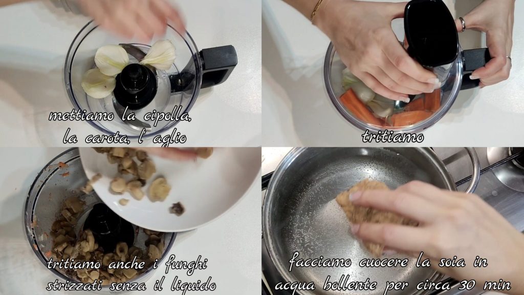 We malen de ui, wortelen en knoflook die eerder zijn schoongemaakt en gewassen. We hakken ook de goed uitgeknepen champignons zonder vloeistof fijn. Ondertussen koken we de soja in kokend water gedurende ongeveer 30 minuten.