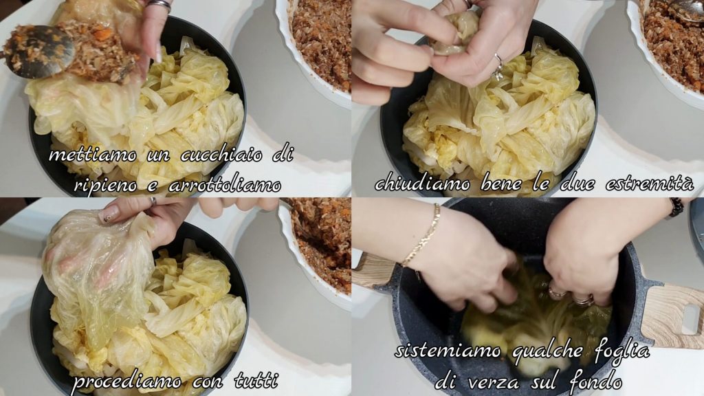 We openen het blad en leggen er een lepel vulling op, daarna rollen we het op en sluiten we de uiteinden goed af (bekijk de video). We gaan zo door totdat de ingrediënten op zijn. We nemen een braadpan en leggen op de bodem een beetje kool