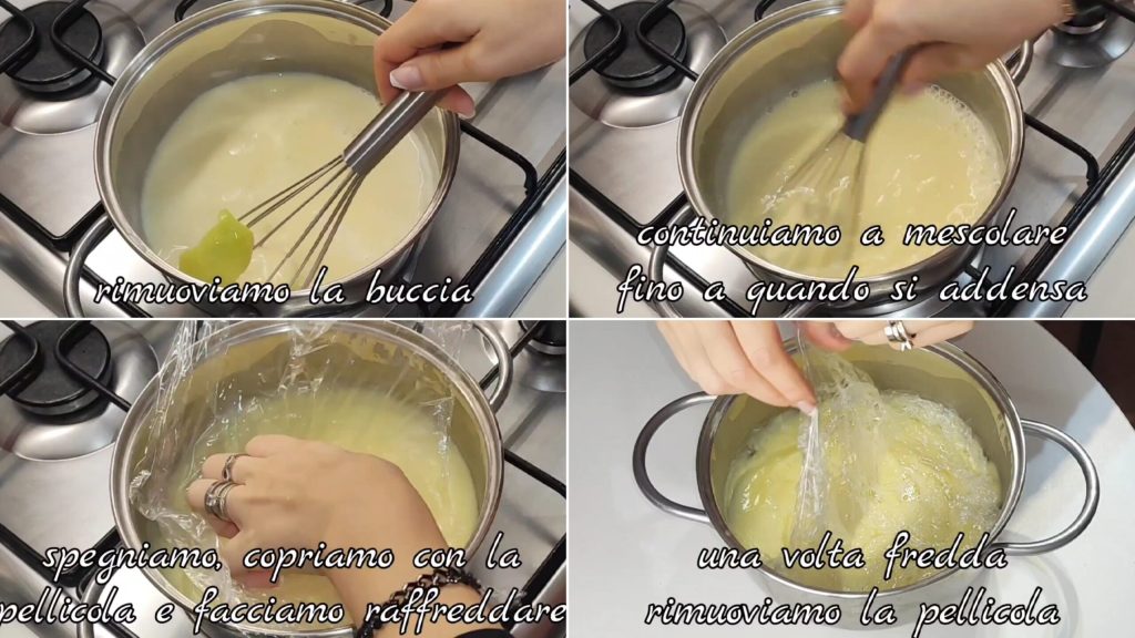 We voegen de melk toe en mengen, evenals de citroenschil. We zetten het op het vuur om het te laten indikken, terwijl we constant blijven roeren.