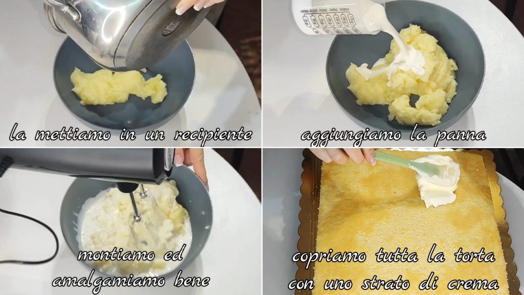 we doen het in een kom, voegen de room toe en kloppen en mengen met de mixer tot we een dikke en homogene room hebben verkregen. We bedekken de hele taart met een laag room.