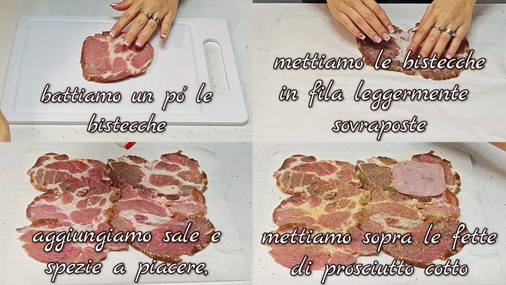 Eerst nemen we de steaks en slaan we ze om ze zoveel mogelijk uit te rekken. We leggen ze in een rij met een lichte overlapping. Voeg zout en kruiden naar smaak toe. Leg de plakken gekookte ham er bovenop,