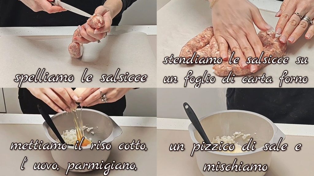 Eerst pellen we de worsten en leggen ze op een vel bakpapier, we drukken goed aan met onze handen om een rechthoek te krijgen. In een kom doen we de gekookte rijst, het ei, de Parmezaanse kaas, een snufje zout en mengen. We leggen het verkregen mengsel bovenop de worsten. We voegen een grote knakworst toe en rollen op. We sluiten en bakken op 180°C voor ongeveer 40 min.