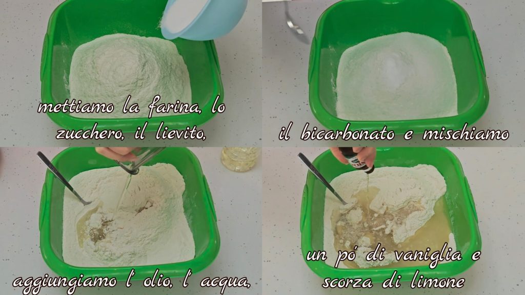 In een kom doen we de bloem, suiker, bakpoeder en het zuiveringszout en mengen we. We voegen de olie, water, vanille en citroenschil naar smaak toe.