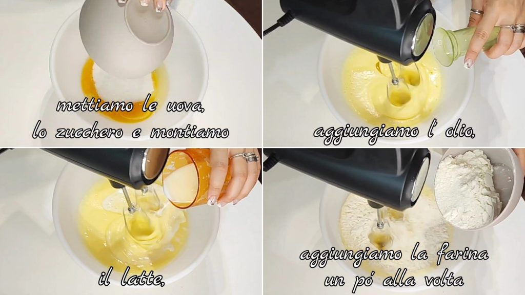 In een kom doen we de eieren, de suiker en kloppen met de elektrische garde. We voegen de olie, de melk, de bloem beetje bij beetje toe en mengen.
