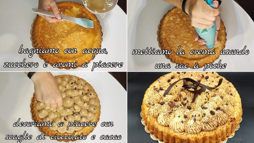 We bevochtigen met water, suiker en aroma’s naar keuze. We brengen de verkregen room aan met een spuitzak. We decoreren naar wens met chocoladeschilfers en cacao. Plaats enkele uren in de koelkast.