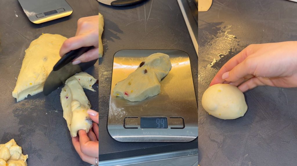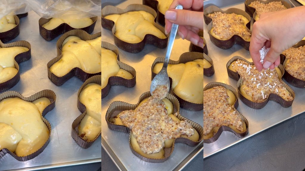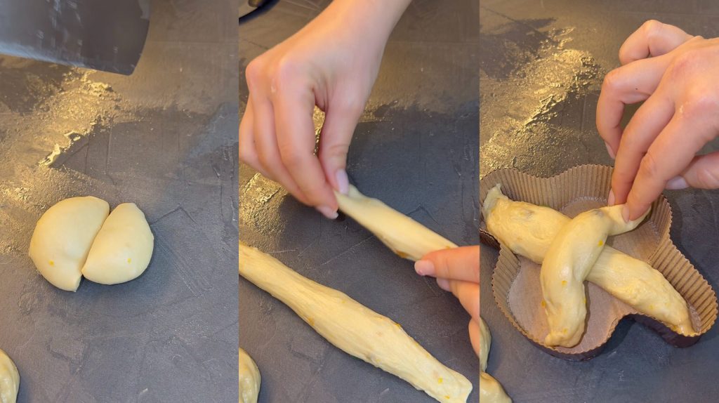 Ik rol er staafjes van en leg ze in de mallen op elkaar om de vorm van de colomba te krijgen.
