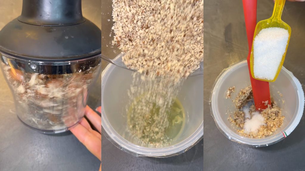 Ik hak de amandelen fijn en doe ze in een kom.