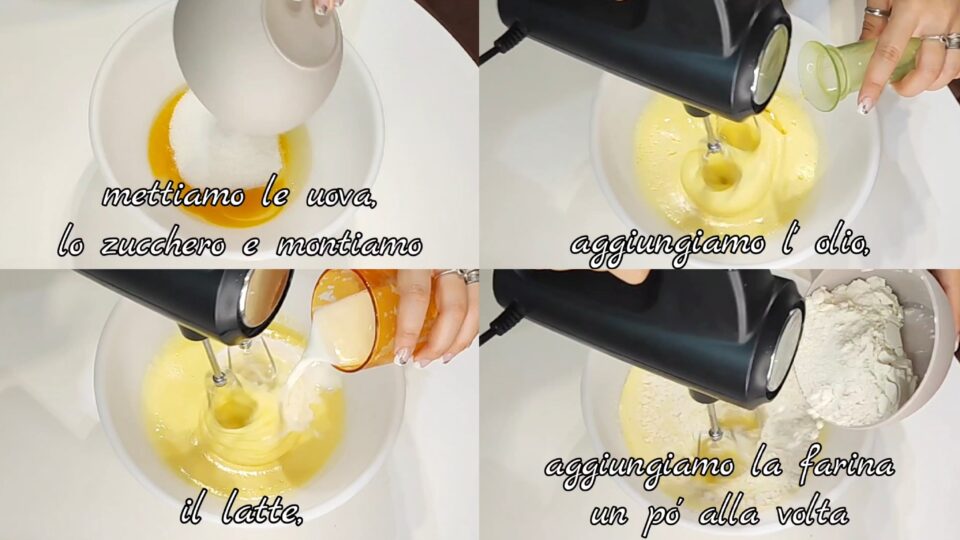 In een kom doen we de eieren, de suiker en kloppen we met de elektrische mixer. We voegen de olie, de melk toe en mengen. We voegen beetje bij beetje de gezeefde bloem toe en mengen.