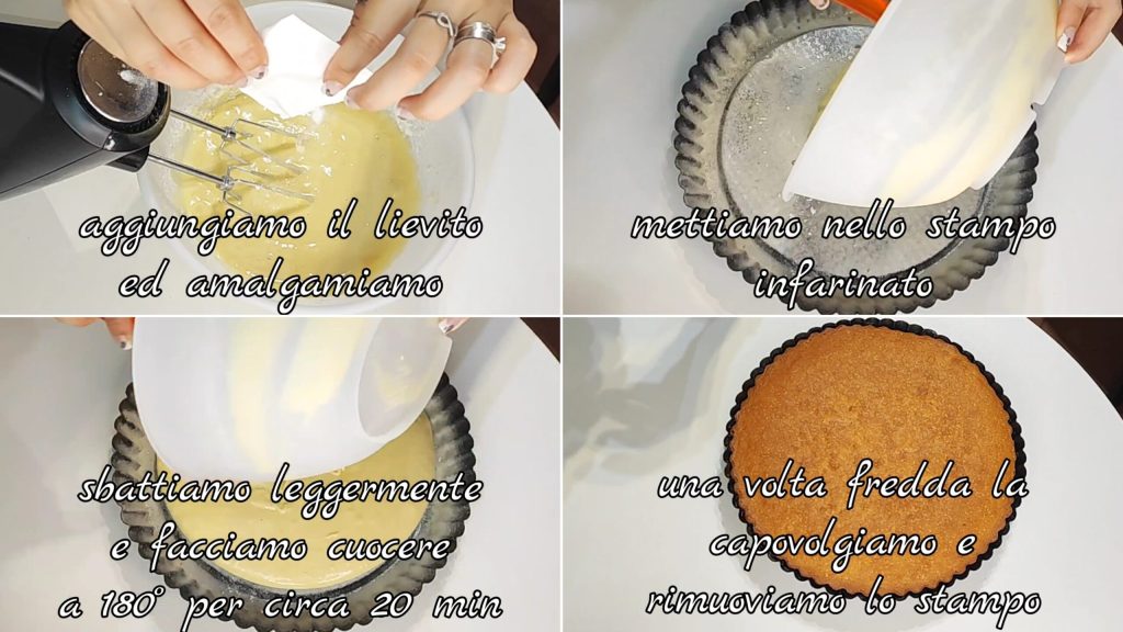 We gieten het verkregen mengsel in de met bloem bestoven slimme taartvorm (met dubbele bodem). Klop zachtjes om het mengsel gelijkmatig te maken en bak op 180° gedurende 20/25 minuten. Laat afkoelen nadat het is gebakken, draai het dan om en verwijder de vorm.