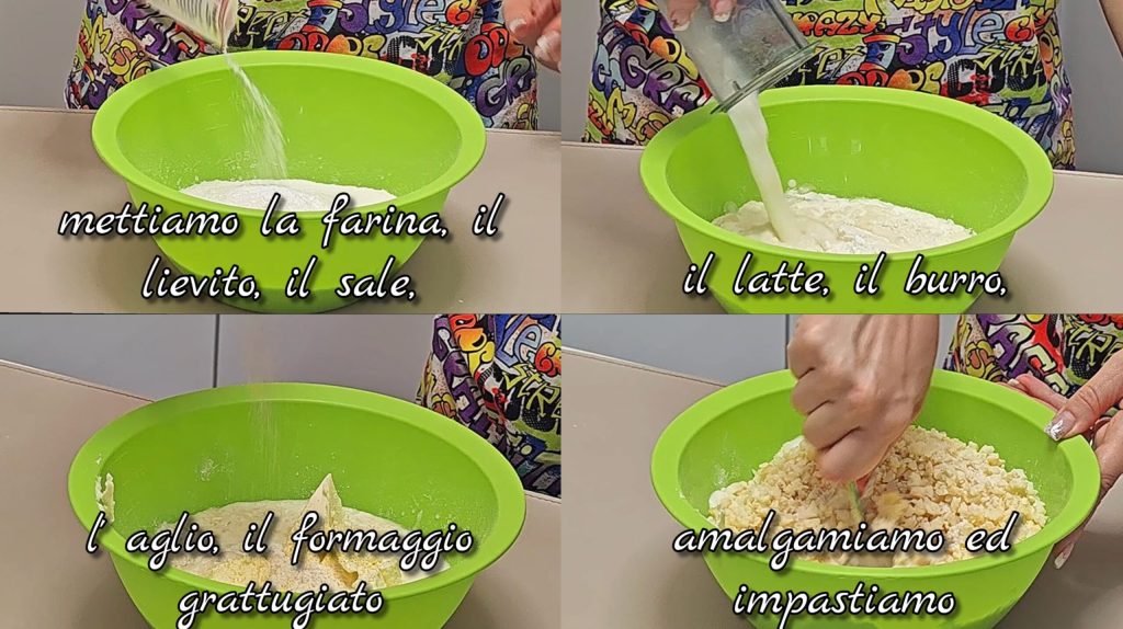 Doe bloem, gist en zout in een kom. Voeg de melk, zachte boter, knoflook en geraspte kaas toe. Meng en kneed tot een zacht en homogeen deeg.