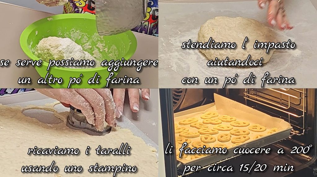 Als het deeg te zacht is, voeg dan nog wat bloem toe. Leg het deeg op licht met bloem bestoven bakpapier. Rol het uit met een deegroller tot een dikte van ongeveer 1 cm. Steek er met een vormpje taralli uit. Leg ze op een met bakpapier beklede bakplaat, met een beetje ruimte ertussen. Bak in een voorverwarmde oven op 200°C gedurende 15-20 minuten, tot ze goudbruin en knapperig zijn