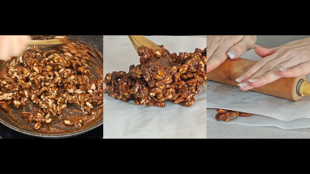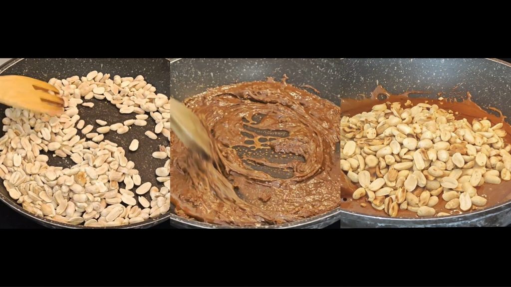Rooster de pinda’s in een pan, laat de suiker karamelliseren en voeg de eerder geroosterde pinda’s toe.