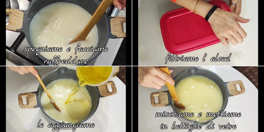 zet uit en laat goed afkoelen. Eenmaal afgekoeld, filter de alcohol en voeg deze toe. Meng en giet de limoncello crème in glazen flessen die van tevoren gesteriliseerd zijn.