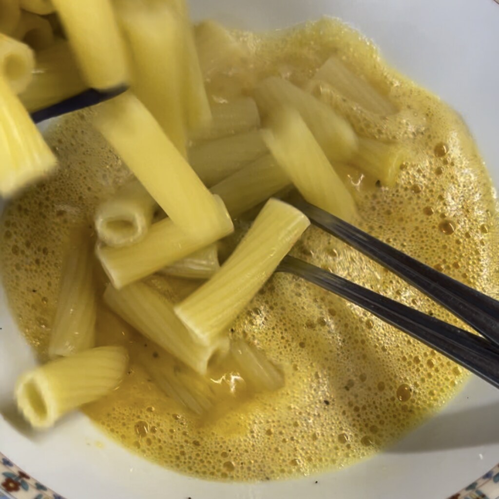 • Giet de pasta al dente af en meng deze met de geklopte eieren in de kom