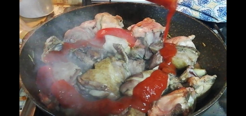 Een gerecht op basis van kippenbouten en -dijen, eerst geroosterd met de huid naar beneden, gekruid met kruiden en tomatenpuree of -pulp voor wie dat verkiest.