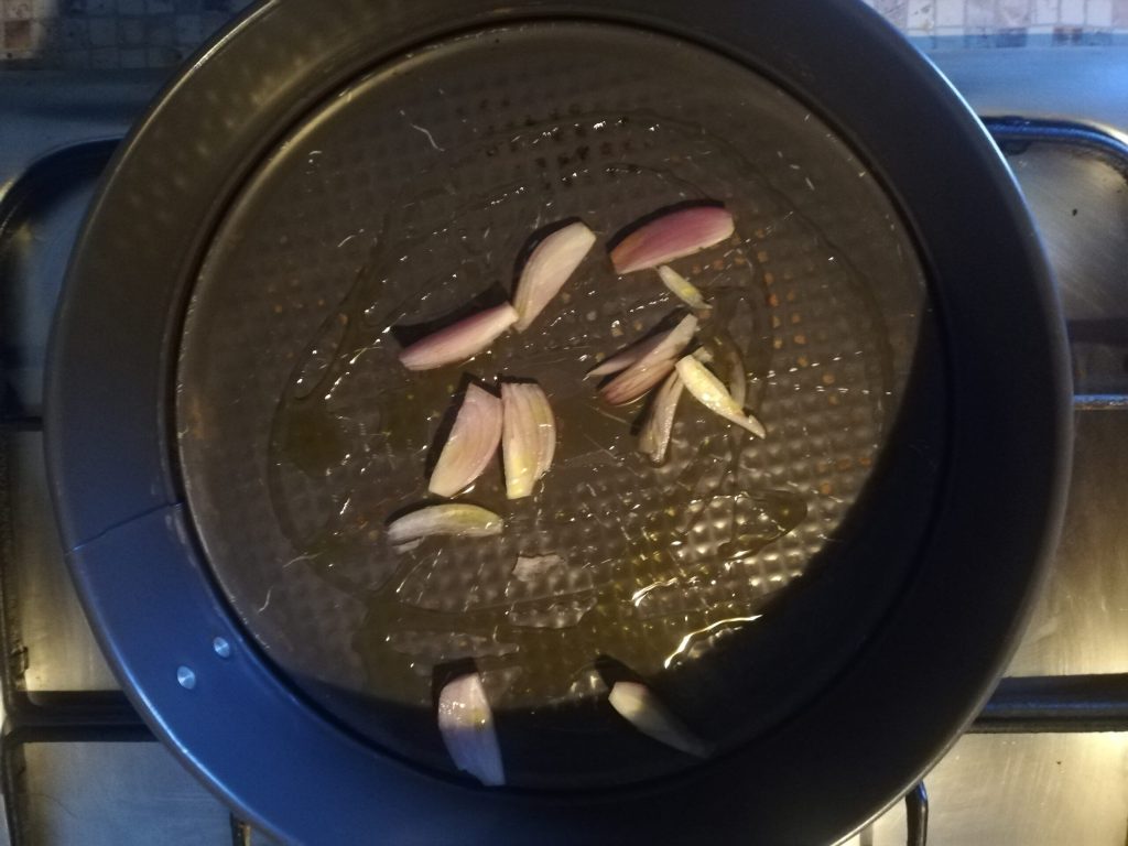 • Giet olie en gesneden sjalot in een ovenschaal;