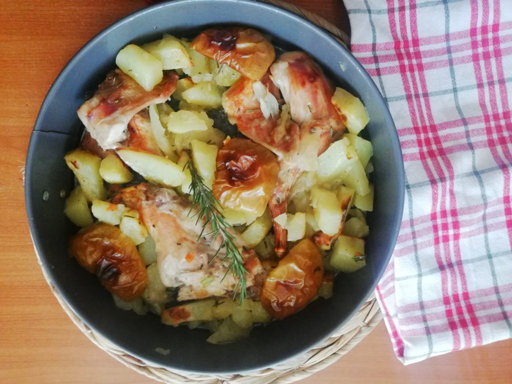 Recept konijn uit de oven met aardappelen, een zondagsgerecht om in gezinsverband van te genieten, misschien onder het genot van een goede wijn uit de Marken, geproduceerd in Ancona, de Lacrima di Morro d’Alba.