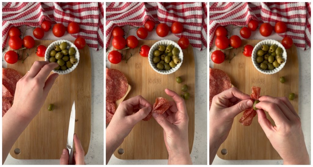 Om de gingerbread man hapjes te maken, bereid je eerst de strikjes, de vlinderdas van onze man: snijd de zijkant van een olijf, vouw een plakje salami als een accordeon en plaats deze in de gesneden olijf. Herhaal dezelfde procedure voor alle olijven en zet apart.