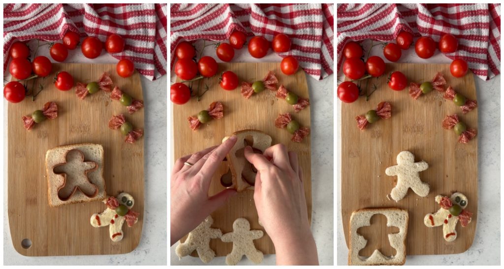 Doe de ketchup in een spuitzak, dit zal je veel helpen bij het decoreren. Maar als je bijzonder handig bent, kun je het met de hand doen. Snijd de sneetjes brood met een gingerbread man koekjesvorm.