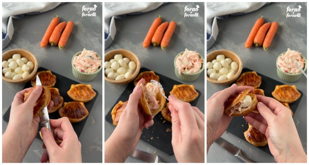 • Vouw vervolgens de bovenkant van elke cirkel tot je de vorm van een schelp krijgt, zoals je op de foto’s ziet. Bestrijk de cirkels met een losgeklopt ei en snijd met een mes inkepingen zonder te diep te snijden. Bak in een voorverwarmde statische oven op 180°C gedurende 13 minuten, de bovenkant moet mooi goudbruin zijn.