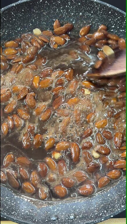 Om gesuikerde amandelen te bereiden, doe je eerst de amandelen in een anti-aanbak pan,