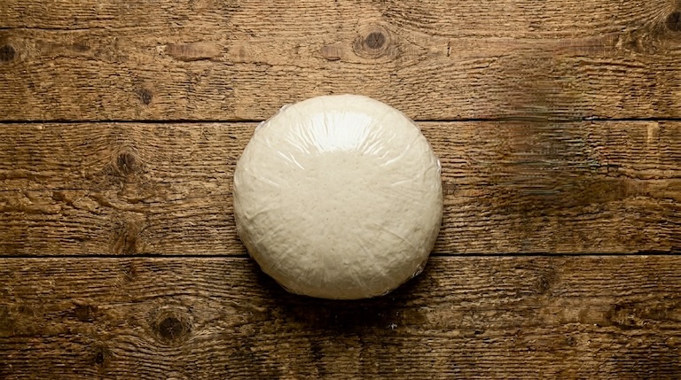 Het geheim voor een perfecte piadina? Haast je niet met bakken. Het laten rusten van het deegblok geeft het gluten de tijd om te ontspannen, zodat het deeg niet als een elastiek terugveert wanneer je gaat uitrollen en je het heel dun kunt krijgen.