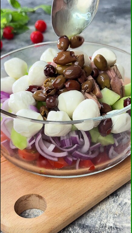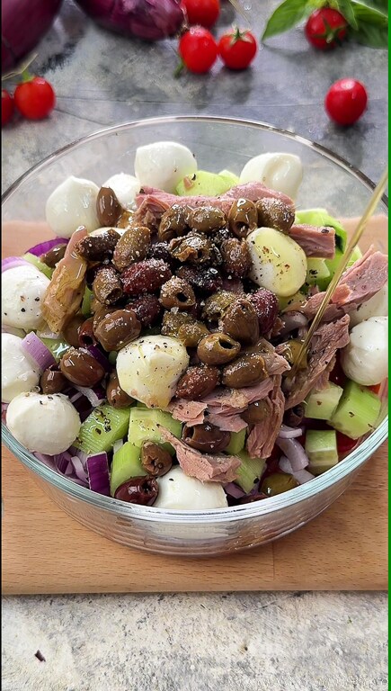De kersentomaatjesalade is een frisse, snelle en smaakvolle zomerse recept, ideaal om op de warmste dagen op tafel te zetten. Gemaakt met simpele en authentieke ingrediënten zoals zoete tomaatjes, rode ui van Tropea, knapperige komkommer, tonijn en cherrymozzarella, is deze salade perfect als bijgerecht of als lichte hoofdmaaltijd. De toevoeging van olijven en verse basilicum maakt het gerecht compleet, geurend en smakelijk.