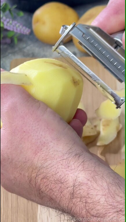 Denk nu aan de aardappelen, verwijder de schil met een dunschiller,