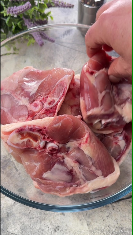 Om de kip met aardappelen in de airfryer te bereiden, begin je met het overbrengen van de kip in een kom,
