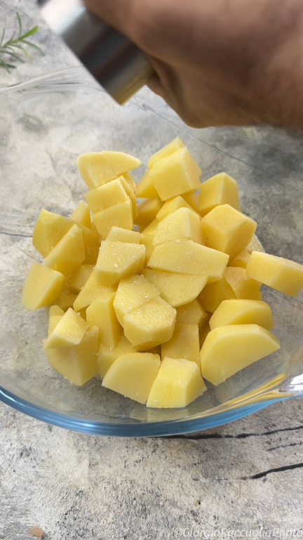Breng de in blokjes gesneden aardappelen over in een kom en breng op smaak met zout,