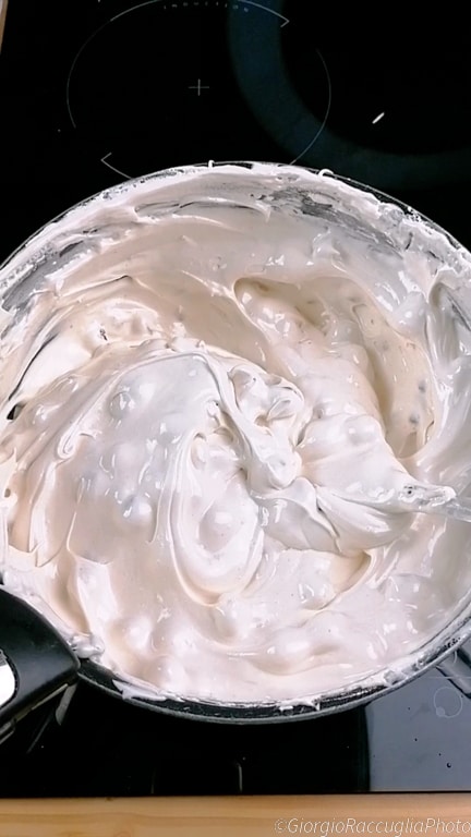 giet het langzaam bij de geklopte eiwitten en blijf werken met de mixer.