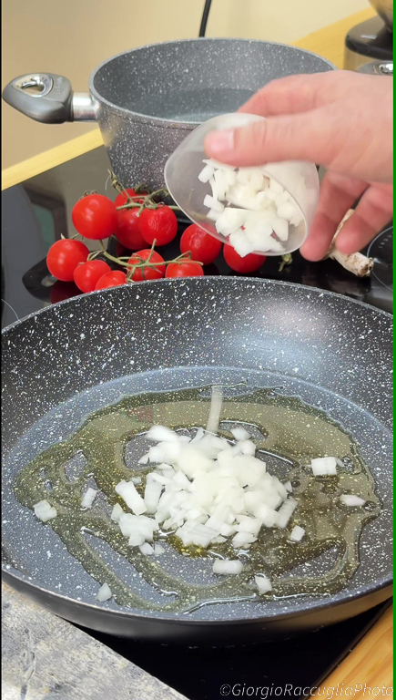 Verhit in een grote koekenpan de extra vergine olijfolie en voeg de fijngehakte ui toe. Laat het op laag vuur zacht worden totdat het transparant is.