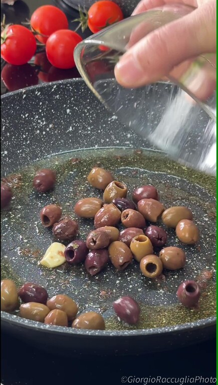 Om de pasta alla puttanesca te bereiden, begin je met het gieten van een scheutje extra vergine olijfolie in de pan,