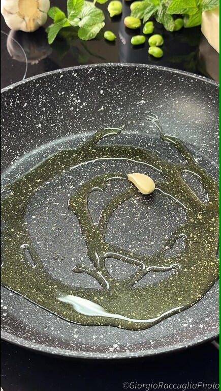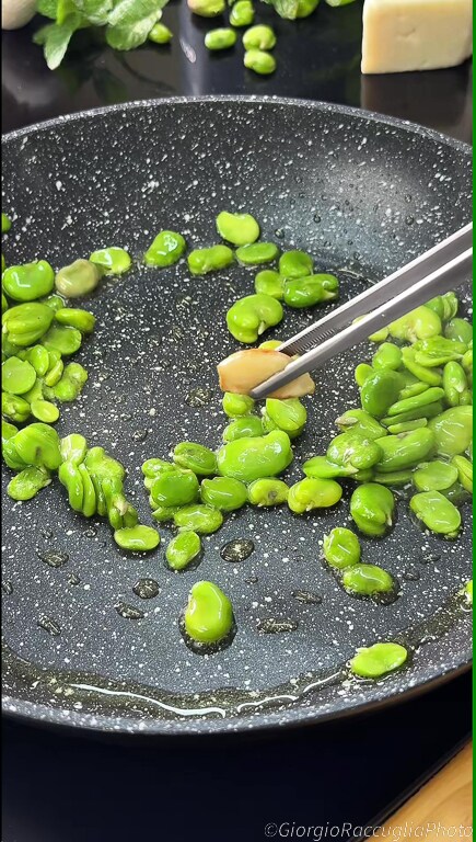 Als ze geblancheerd zijn, doe de tuinbonen in de pan, breng op smaak met zout en peper en laat ze 5 minuten op laag vuur sudderen.