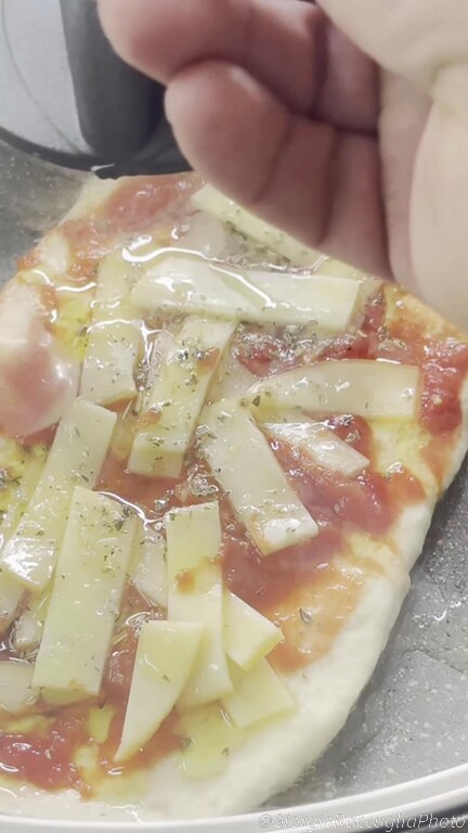 Om de smaak van de pizzette te verrijken, voorziet de topping in ingrediënten die harmonieus samengaan. Verse tomaat voegt een vleugje frisheid en zoetheid toe, terwijl gerookte scamorza bijdraagt met zijn romigheid en een onweerstaanbare rokerige geur. Een snufje zout en peper versterken de smaken, terwijl oregano een aromatische en mediterrane noot toevoegt.