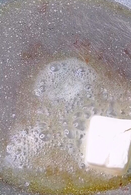 Laat ondertussen in de ruime koekenpan de boter smelten, voeg de olie toe, laat het smaken en verwijder het met een tang.