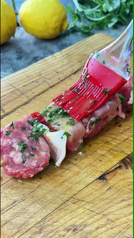 Gemaakt met worst, spek, varkenshaas en paprika’s, zijn deze spiesjes mals, sappig en kleurrijk. Het bakken in de pan maakt ze praktisch en ideaal voor wie weinig tijd heeft, zonder in te boeten op smaak. De dressing met extra vergine olijfolie, citroensap en verse peterselie geeft frisheid en aroma, waardoor ze nog smakelijker worden.