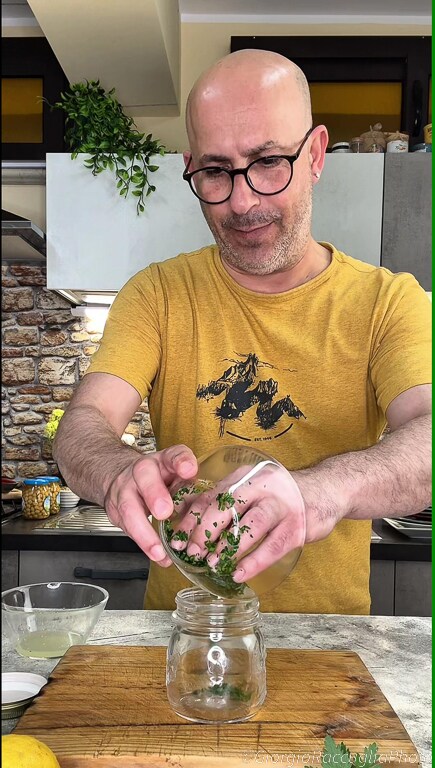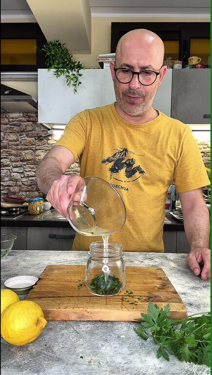 Als alle spiesjes zijn samengesteld, bereid je de dressing voor. In een pot met deksel doe je: gehakte peterselie,
