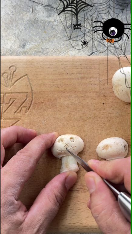 Maak met het rietje twee gaatjes in de bovenkant van de champignons: dit zullen de ogen zijn.