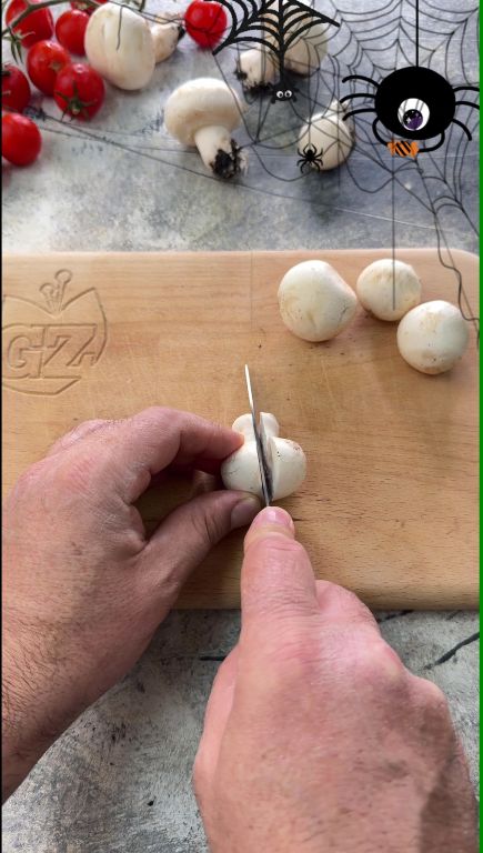 Om de spookachtige Halloween-pizza te maken, begin met het halveren van de champignons.