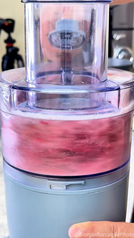 • Pureer goed totdat je een gladde, compacte puree krijgt. Het is essentieel dat de vruchten bevroren zijn: de kou van de vruchten helpt het mengsel beter te laten opstijven wanneer je de eiwitten toevoegt.