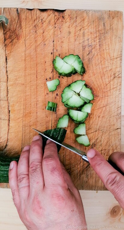 Om de zomerse frisse salade te bereiden, zet je alle ingrediënten klaar. Begin met de groene sla, verwijder de buitenste bladeren van de ijsbergsla en snijd deze,